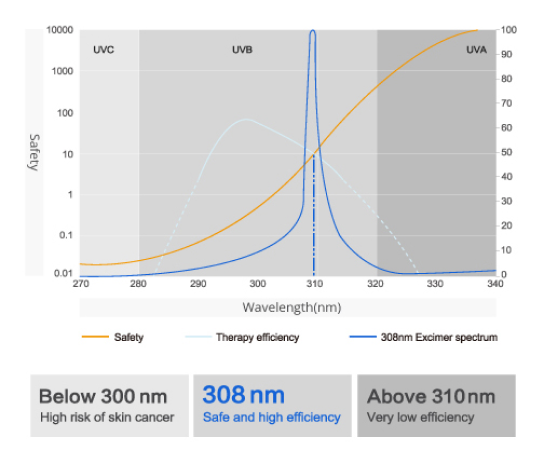308nm Excimer UV-light is a single wavelength light by using Xecl as illumination, to induce T cells apoptosis and improve pigment synthesis. It is regarded as the gold standard to treat vitiligo because of the excellent efficacy, low operation cost, short treatment course and less adverse reactions.