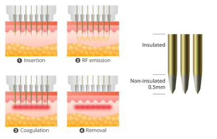 RF Micro-needling is a combination of microneedling and radiofrequency technology. It uses tiny needles to create micro-channels in the skin, which allows the RF energy to penetrate deeper into the skin. Insulated micro-needles allow targeting of varying depths of the dermis by precise control, to induce remodeling and new collagen formation for tightening and rejuvenating benefits.